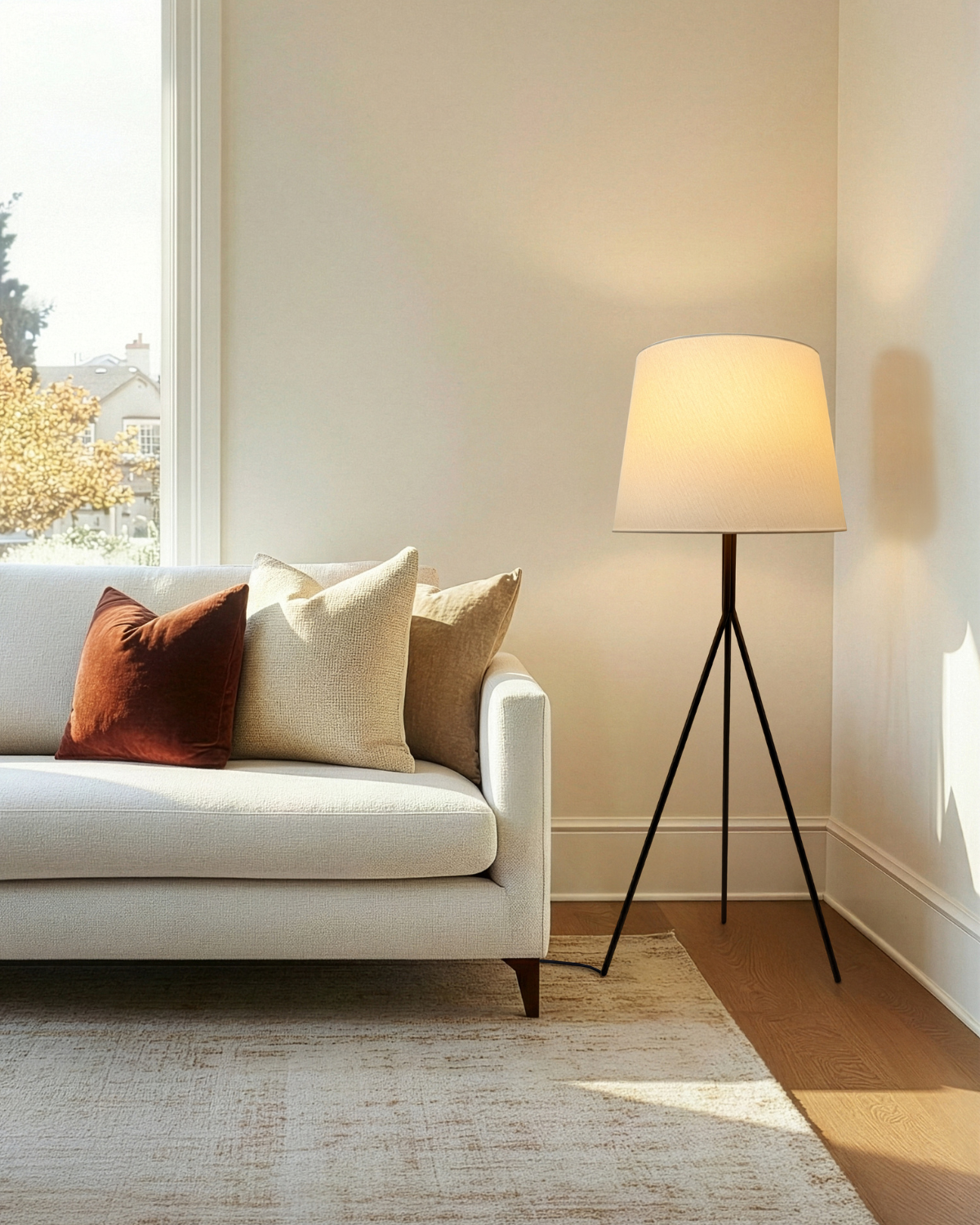 The Forge floor lamp features an oversized fabric shade and a tripod base will take your decor to the next level. The sleek metal base is a hard contrast to the natural empire shade adding sophistication to its design. This lamp also features a color changing bulb adjustable to five different temperatures allowing to set the mood for any occasion.
